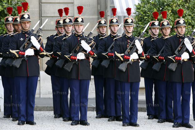 Légende : 0101/08/2007-PARIS- Nicolas Sarkozy reçoit le president egyptien Hosni Moubarak a l'Elysee. La Garde Republicaine (parmi elle, sur la photo, deux femmes: G et 2eD) se met en place avant l'arrivee du cortege officiel dans la cour de l'Elysee. PHOTO: Vincent NGUYEN / Riva Press
