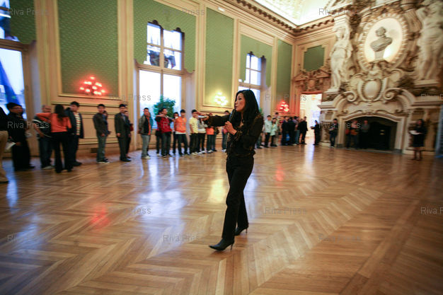 Légende : Lise Han, responsable Asie à la ville de Tours, accueille des couples chinois en compagnie du maire de Tours Jean Germain. Chaque annee, la Ville de Tours organise les 'Noces romantiques en Touraine'. Cette annee, 28 couples chinois originaires de Tianjin ont ete unis symboliquement par le maire. Les maries visitent la cathedrale de Tours. Tours, FRANCE-06/05/2008