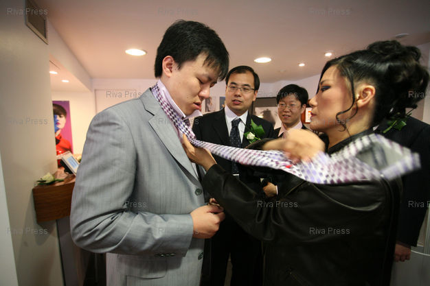 Légende : Lise Han, responsable Asie à la ville de Tours, accueille des couples chinois en compagnie du maire de Tours Jean Germain. Chaque annee, la Ville de Tours organise les 'Noces romantiques en Touraine'. Cette annee, 28 couples chinois originaires de Tianjin ont ete unis symboliquement par le maire. Les maries visitent la cathedrale de Tours. Tours, FRANCE-06/05/2008