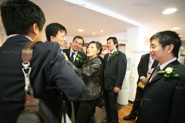 Légende : Lise Han, responsable Asie à la ville de Tours, accueille des couples chinois en compagnie du maire de Tours Jean Germain. Chaque annee, la Ville de Tours organise les 'Noces romantiques en Touraine'. Cette annee, 28 couples chinois originaires de Tianjin ont ete unis symboliquement par le maire. Les maries visitent la cathedrale de Tours. Tours, FRANCE-06/05/2008