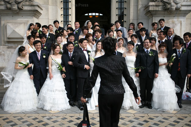 Légende : Lise Han, responsable Asie à la ville de Tours, accueille des couples chinois en compagnie du maire de Tours Jean Germain. Chaque annee, la Ville de Tours organise les 'Noces romantiques en Touraine'. Cette annee, 28 couples chinois originaires de Tianjin ont ete unis symboliquement par le maire. Les maries visitent la cathedrale de Tours. Tours, FRANCE-06/05/2008