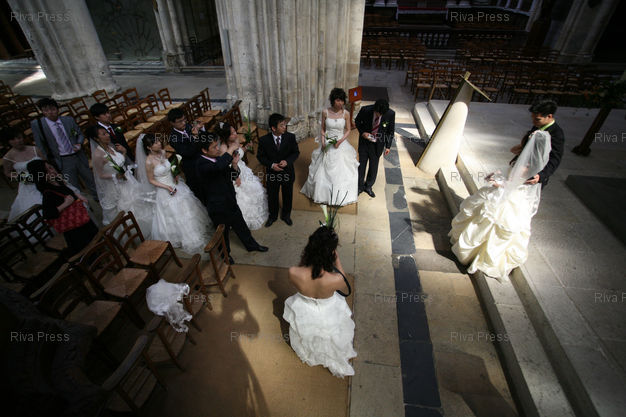 Légende : Lise Han, responsable Asie à la ville de Tours, accueille des couples chinois en compagnie du maire de Tours Jean Germain. Chaque annee, la Ville de Tours organise les 'Noces romantiques en Touraine'. Cette annee, 28 couples chinois originaires de Tianjin ont ete unis symboliquement par le maire. Les maries visitent la cathedrale de Tours. Tours, FRANCE-06/05/2008