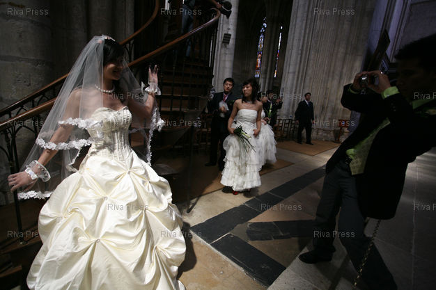 Légende : Lise Han, responsable Asie à la ville de Tours, accueille des couples chinois en compagnie du maire de Tours Jean Germain. Chaque annee, la Ville de Tours organise les 'Noces romantiques en Touraine'. Cette annee, 28 couples chinois originaires de Tianjin ont ete unis symboliquement par le maire. Les maries visitent la cathedrale de Tours. Tours, FRANCE-06/05/2008