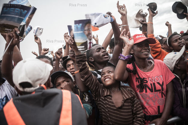 Légende : 18/12/2013 - Antananarivo, MADAGASCAR - Des sympathisants du candidat à la présidentielle Hery Rajaonarimampianina, dont la candidature est soutenue par le Président de la Transition Andry Rajoelina, participent à son dernier meeting de campagne à Antananarivo. Les Malgaches éliront leur président lors du vote pour le second tour le 20 décembre 2013. PHOTO : RIJASOLO / RIVA PRESS