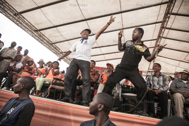 Légende : 18/12/2013 - Antananarivo, MADAGASCAR - Le candidat à la présidentielle Hery Rajaonarimampianina (G) lors de son dernier meeting de campagne à Antananarivo. Les Malgaches éliront leur président lors du vote pour le second tour le 20 décembre 2013. PHOTO : RIJASOLO / RIVA PRESS