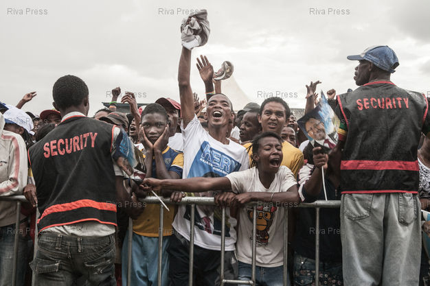 Légende : 18/12/2013 - Antananarivo, MADAGASCAR - Des sympathisants du candidat à la présidentielle Hery Rajaonarimampianina, dont la candidature est soutenue par le Président de la Transition Andry Rajoelina, participent à son dernier meeting de campagne à Antananarivo. Les Malgaches éliront leur président lors du vote pour le second tour le 20 décembre 2013. PHOTO : RIJASOLO / RIVA PRESS