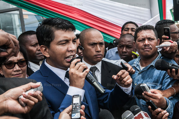 Caption : 22/01/2014 - Antananarivo, MADAGASCAR - Andry Rajoelina (C), Président du régime de Transition de Madagascar, parle de son avenir politique devant les journalistes pendant l'inauguration d'un hopital à Antananarivo. PHOTO : RIJASOLO / RIVA PRESS