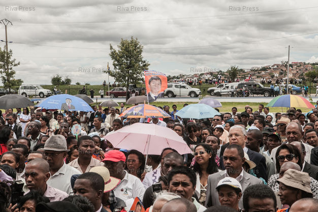 Caption : 22/01/2014 - Antananarivo, MADAGASCAR - Public pendant l'inauguration d'un hopital à Antananarivo alors que Andry Rajoelina (C), Président du régime de Transition de Madagascar, parle de son avenir politique devant les journalistes. PHOTO : RIJASOLO / RIVA PRESS