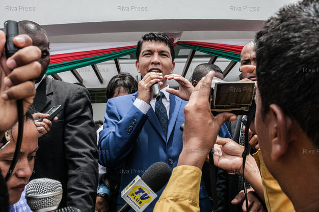 Caption : 22/01/2014 - Antananarivo, MADAGASCAR - Andry Rajoelina (C), Président du régime de Transition de Madagascar, parle de son avenir politique devant les journalistes pendant l'inauguration d'un hopital à Antananarivo. PHOTO : RIJASOLO / RIVA PRESS