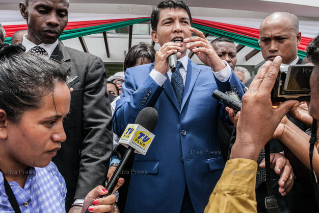 Caption : 22/01/2014 - Antananarivo, MADAGASCAR - Andry Rajoelina (C), Président du régime de Transition de Madagascar, parle de son avenir politique devant les journalistes pendant l'inauguration d'un hopital à Antananarivo. PHOTO : RIJASOLO / RIVA PRESS