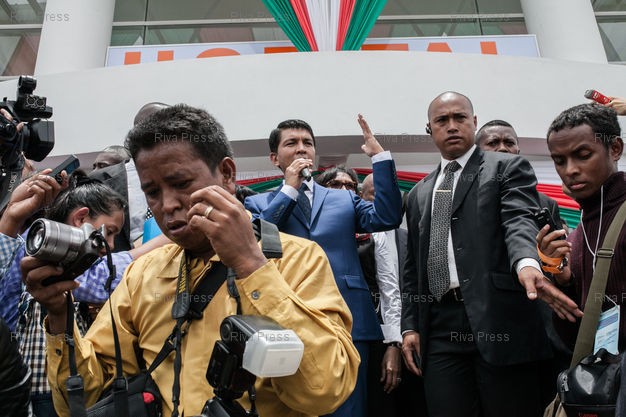 Légende : 22/01/2014 - Antananarivo, MADAGASCAR - Andry Rajoelina (C), Président du régime de Transition de Madagascar, parle de son avenir politique devant les journalistes pendant l'inauguration d'un hopital à Antananarivo. PHOTO : RIJASOLO / RIVA PRESS
