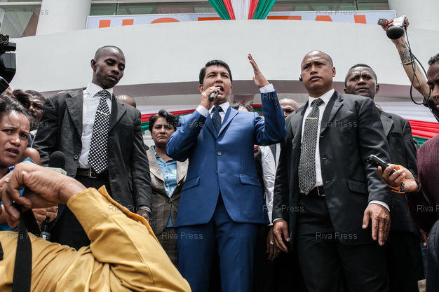 Légende : 22/01/2014 - Antananarivo, MADAGASCAR - Andry Rajoelina (C), Président du régime de Transition de Madagascar, parle de son avenir politique devant les journalistes pendant l'inauguration d'un hopital à Antananarivo. PHOTO : RIJASOLO / RIVA PRESS