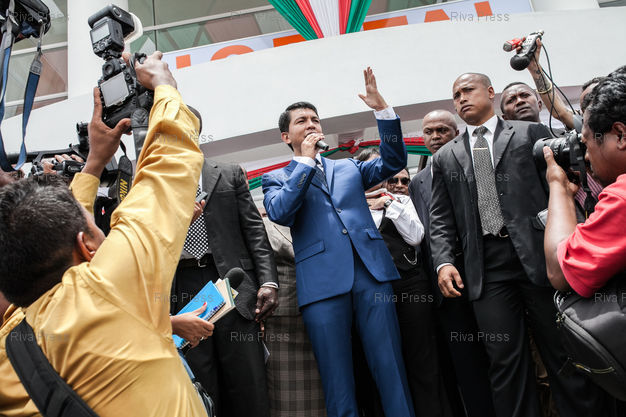 Caption : 22/01/2014 - Antananarivo, MADAGASCAR - Andry Rajoelina (C), Président du régime de Transition de Madagascar, parle de son avenir politique devant les journalistes pendant l'inauguration d'un hopital à Antananarivo. PHOTO : RIJASOLO / RIVA PRESS