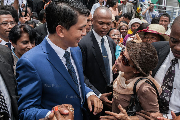 Légende : 22/01/2014 - Antananarivo, MADAGASCAR - Des partisans saluent Andry Rajoelina (C), Président du régime de Transition de Madagascar, pendant l'inauguration d'un hopital à Antananarivo. PHOTO : RIJASOLO / RIVA PRESS