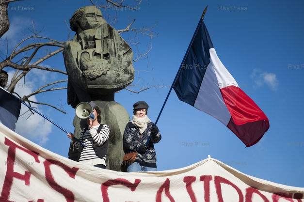 Légende : Des manifestants de la Manif pour tous defilent a Paris pour s'opposer notamment a la theorie du genre, a la "familiphobie", ainsi qu'a la PMA pour les couples homosexuels et a la GPA dont ils redoutent qu'elles fassent partie de la prochaine loi Famille. Le 02/02/2014. /// Supporters of the "Manif Pour Tous" movement demonstrate to defend their vision of the traditional family in Paris. "Manif pour tous" movement has previously opposed the legalisation of gay marriage in France. On 02/02/2014. /// PHOTO Vincent Boisot/Riva Press