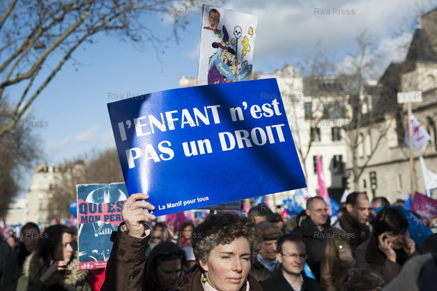 Légende : Des manifestants de la Manif pour tous defilent a Paris pour s'opposer notamment a la theorie du genre, a la "familiphobie", ainsi qu'a la PMA pour les couples homosexuels et a la GPA dont ils redoutent qu'elles fassent partie de la prochaine loi Famille. Le 02/02/2014. /// Supporters of the "Manif Pour Tous" movement demonstrate to defend their vision of the traditional family in Paris. "Manif pour tous" movement has previously opposed the legalisation of gay marriage in France. On 02/02/2014. /// PHOTO Vincent Boisot/Riva Press