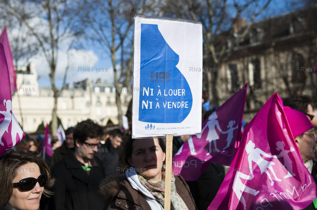 Légende : Des manifestants de la Manif pour tous defilent a Paris pour s'opposer notamment a la theorie du genre, a la "familiphobie", ainsi qu'a la PMA pour les couples homosexuels et a la GPA dont ils redoutent qu'elles fassent partie de la prochaine loi Famille. Le 02/02/2014. /// Supporters of the "Manif Pour Tous" movement demonstrate to defend their vision of the traditional family in Paris. "Manif pour tous" movement has previously opposed the legalisation of gay marriage in France. On 02/02/2014. /// PHOTO Vincent Boisot/Riva Press