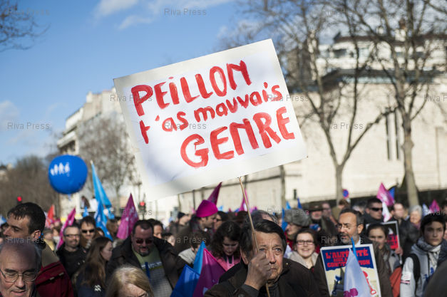 Légende : Des manifestants de la Manif pour tous defilent a Paris pour s'opposer notamment a la theorie du genre, a la "familiphobie", ainsi qu'a la PMA pour les couples homosexuels et a la GPA dont ils redoutent qu'elles fassent partie de la prochaine loi Famille. Le 02/02/2014. /// Supporters of the "Manif Pour Tous" movement demonstrate to defend their vision of the traditional family in Paris. "Manif pour tous" movement has previously opposed the legalisation of gay marriage in France. On 02/02/2014. /// PHOTO Vincent Boisot/Riva Press