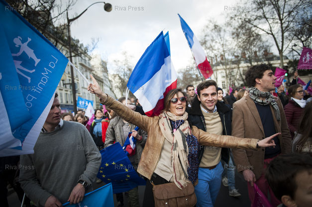 Légende : Des manifestants de la Manif pour tous defilent a Paris pour s'opposer notamment a la theorie du genre, a la "familiphobie", ainsi qu'a la PMA pour les couples homosexuels et a la GPA dont ils redoutent qu'elles fassent partie de la prochaine loi Famille. Le 02/02/2014. /// Supporters of the "Manif Pour Tous" movement demonstrate to defend their vision of the traditional family in Paris. "Manif pour tous" movement has previously opposed the legalisation of gay marriage in France. On 02/02/2014. /// PHOTO Vincent Boisot/Riva Press