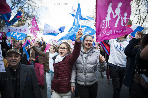 Légende : Des manifestants de la Manif pour tous defilent a Paris pour s'opposer notamment a la theorie du genre, a la "familiphobie", ainsi qu'a la PMA pour les couples homosexuels et a la GPA dont ils redoutent qu'elles fassent partie de la prochaine loi Famille. Le 02/02/2014. /// Supporters of the "Manif Pour Tous" movement demonstrate to defend their vision of the traditional family in Paris. "Manif pour tous" movement has previously opposed the legalisation of gay marriage in France. On 02/02/2014. /// PHOTO Vincent Boisot/Riva Press