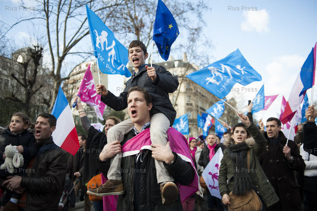 Légende : Des manifestants de la Manif pour tous defilent a Paris pour s'opposer notamment a la theorie du genre, a la "familiphobie", ainsi qu'a la PMA pour les couples homosexuels et a la GPA dont ils redoutent qu'elles fassent partie de la prochaine loi Famille. Le 02/02/2014. /// Supporters of the "Manif Pour Tous" movement demonstrate to defend their vision of the traditional family in Paris. "Manif pour tous" movement has previously opposed the legalisation of gay marriage in France. On 02/02/2014. /// PHOTO Vincent Boisot/Riva Press