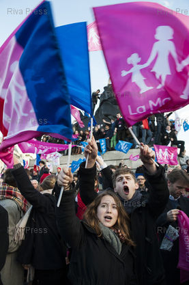 Légende : Des manifestants de la Manif pour tous defilent a Paris pour s'opposer notamment a la theorie du genre, a la "familiphobie", ainsi qu'a la PMA pour les couples homosexuels et a la GPA dont ils redoutent qu'elles fassent partie de la prochaine loi Famille. Le 02/02/2014. /// Supporters of the "Manif Pour Tous" movement demonstrate to defend their vision of the traditional family in Paris. "Manif pour tous" movement has previously opposed the legalisation of gay marriage in France. On 02/02/2014. /// PHOTO Vincent Boisot/Riva Press