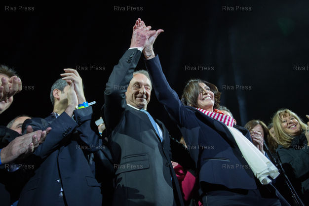 Légende : Anne Hidalgo laisse eclater sa joie apres avoir remporte les elections municipales a Paris. Paris, FRANCE-31/03/2014