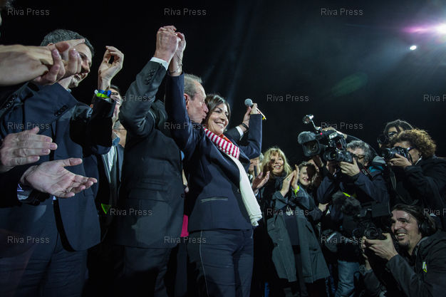 Légende : Anne Hidalgo laisse eclater sa joie apres avoir remporte les elections municipales a Paris. Paris, FRANCE-31/03/2014