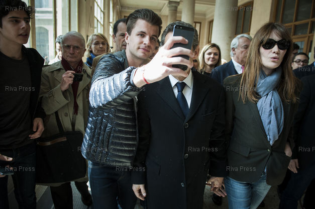 Légende : L'ancien President de la Republique Nicolas Sarkozy et Carla Bruni-Sarkozy votent pour le premier tour des elections municipales 2014 a Paris au lycee La Fontaine dans le 16eme arrondissement. Le 23/03/2014. /// A young man takes a "selfie" with former President Nicolas Sarkozy and his wife Carla Bruni Sarkozy as they leave the polling station after voting in the first round of the French unicipal elections on March 23, 2014 in Paris.