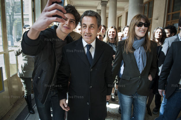 Légende : L'ancien President de la Republique Nicolas Sarkozy et Carla Bruni-Sarkozy votent pour le premier tour des elections municipales 2014 a Paris au lycee La Fontaine dans le 16eme arrondissement. Le 23/03/2014. /// A young man takes a "selfie" with former President Nicolas Sarkozy and his wife Carla Bruni Sarkozy as they leave the polling station after voting in the first round of the French unicipal elections on March 23, 2014 in Paris.