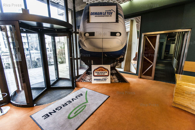 Légende : Chamalieres (Puy-de-Dome), le 19 fevrier 2010 - Affiche pour l'arrivee du TGV dans le hall d'entree du Conseil Regional d'Auvergne a Chamalieres. Depuis Avril 2014, le Conseil regional a demenage dans un nouveau batiment a Clermont-Ferrand. PHOTO: Vincent NGUYEN / Riva Press