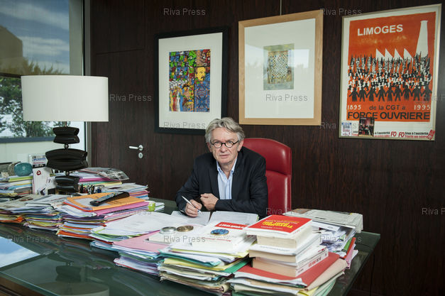 Légende : Jean-Caude Mailly, secretaire general du syndicat Force Ouvriere, pose dans son bureau au siege de l'organisation a Paris. Le 04/07/2014. /// Jean-Claude Mailly, French general secretary of Force Ouvriere (FO), in his office in Paris. /// PHOTO Vincent Boisot/Riva Press