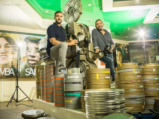 Légende : Eric Toledano et Olivier Nakache posent au siege de la societe ARANE. Clichy, FRANCE-19/09/2014