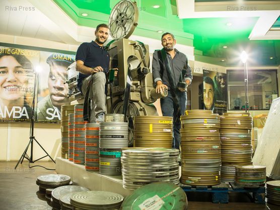 Légende : Eric Toledano et Olivier Nakache posent au siege de la societe ARANE. Clichy, FRANCE-19/09/2014