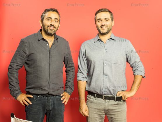 Légende : Eric Toledano et Olivier Nakache posent au siege de la societe ARANE. Clichy, FRANCE-19/09/2014