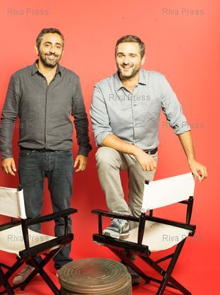 Légende : Eric Toledano et Olivier Nakache posent au siege de la societe ARANE. Clichy, FRANCE-19/09/2014