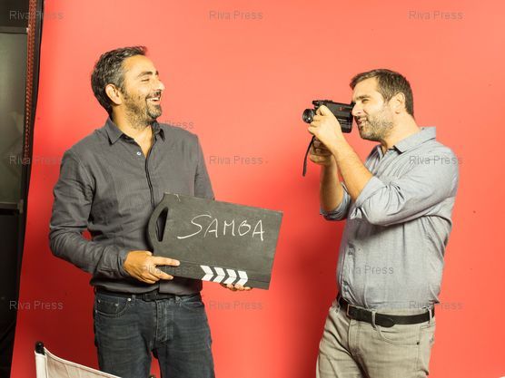 Légende : Eric Toledano et Olivier Nakache posent au siege de la societe ARANE. Clichy, FRANCE-19/09/2014