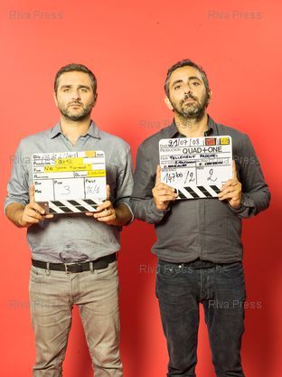 Légende : Eric Toledano et Olivier Nakache posent au siege de la societe ARANE. Clichy, FRANCE-19/09/2014