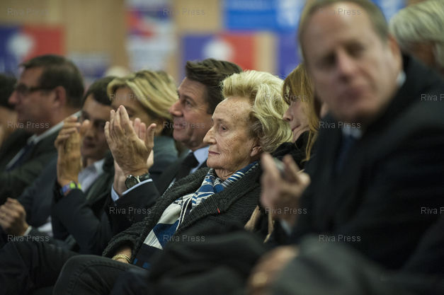 Légende : Reunion publique de Nicolas Sarkozy au parc des expositions de la porte de Versailles a Paris dans le cadre de la campagne pour la presidence de l'UMP. Aved Bernadette Chirac. Le 07/11/2014 /// Public meeting in Paris of former French president Nicolas Sarkozy, candidate for the presidency of France's right-wing main opposition UMP party. 07/11/2014. /// PHOTO Vincent Boisot/Riva Press