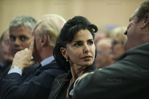 Légende : Reunion publique de Nicolas Sarkozy au parc des expositions de la porte de Versailles a Paris dans le cadre de la campagne pour la presidence de l'UMP. Avec Rachida Dati. Le 07/11/2014 /// Public meeting in Paris of former French president Nicolas Sarkozy, candidate for the presidency of France's right-wing main opposition UMP party. 07/11/2014. /// PHOTO Vincent Boisot/Riva Press
