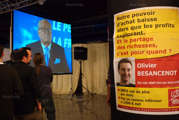 Légende : 18/04/2007 - Montreuil, France - Lors d'un meeting d'Olivier Besancenot à la Mutualité dans le cadre de sa campagne présidentielle 2007