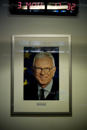 Légende : 03/05/2009 - Strasbourg, FRANCE - Portes Ouvertes au Parlement Europeen pour sensibiliser la population aux elections europeennes de juin 2009. Portrait de Hans-Gert Poettering, president du Parlement Europeen.